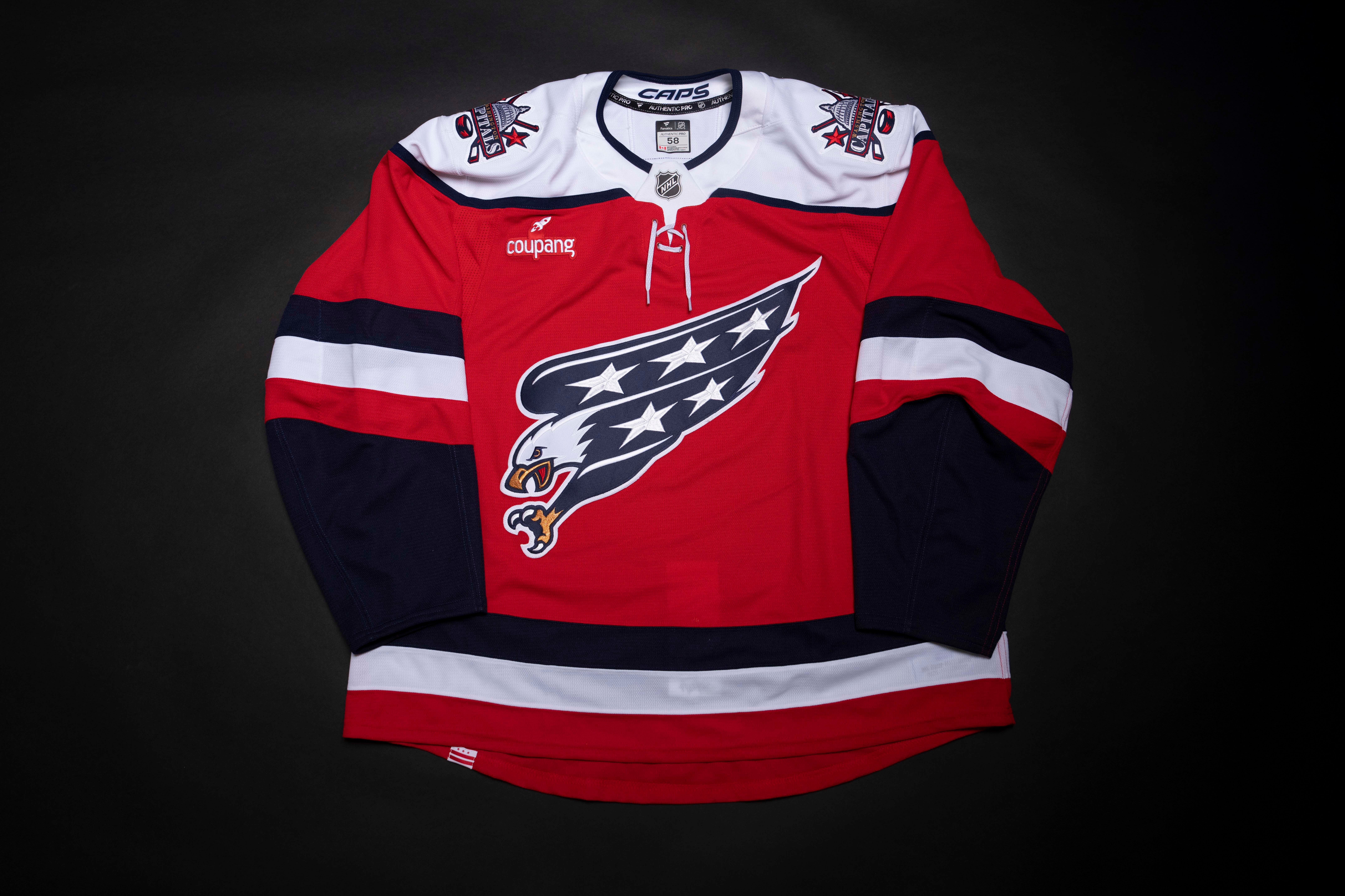On the shoulders is the 1990s Capitol Dome logo, and the jerseys also features a vintage lace-up neckline. Inside the collar is the “Caps” wordmark, and the jersey features the team’s current lettering and number style. The D.C. flag is also stitched onto the bottom of the sweater.