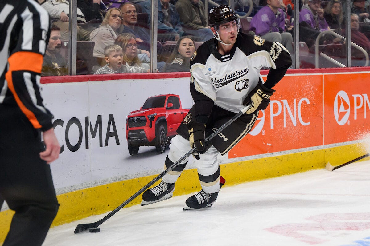 “I have a great relationship with him, so him coming back to the organization was a pleasant surprise,” coach Spencer Carbery said. “He’s played real well down (in Hershey)... for where our forward group is right now and how lines are taking shape, he’s a bigger guy someone who can help us a little bit, stability, bottom-six role, potentially penalty kill, forecheck, strong on the wall. That’s sort of what we’re looking at to give him an opportunity.”
